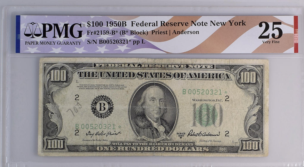 1950B $100 Federal Reserve Note New York Dollar Bill - Fr#2159-B*, B* Block, Priest/Anderson - PMG Graded 25