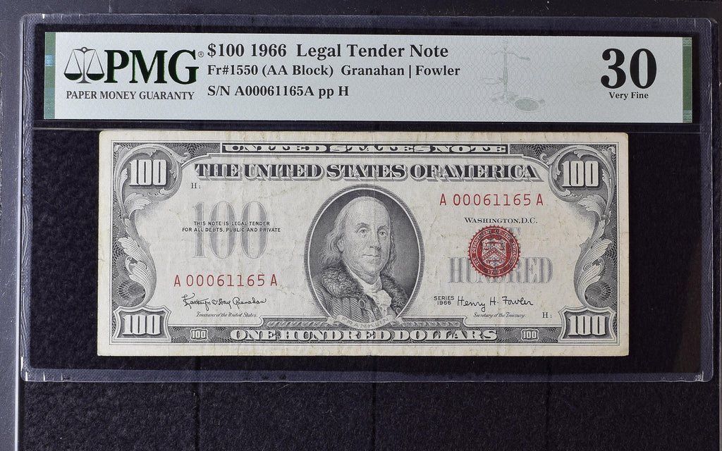 1966 $100 Legal Tender Note Dollar Bill - Fr#1550, AA Block, Granahan/Fowler - PMG Graded 30