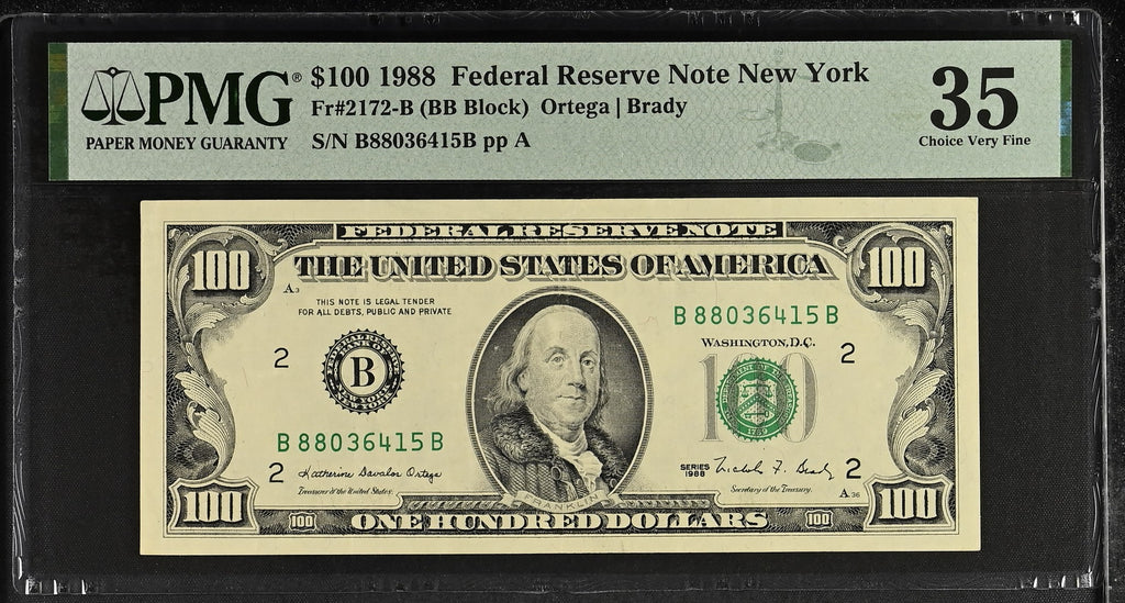 1988 $100 Federal Reserve Note New York Dollar Bill - Fr#2172-B, BB Block, Ortega/Brady - PMG Graded 35