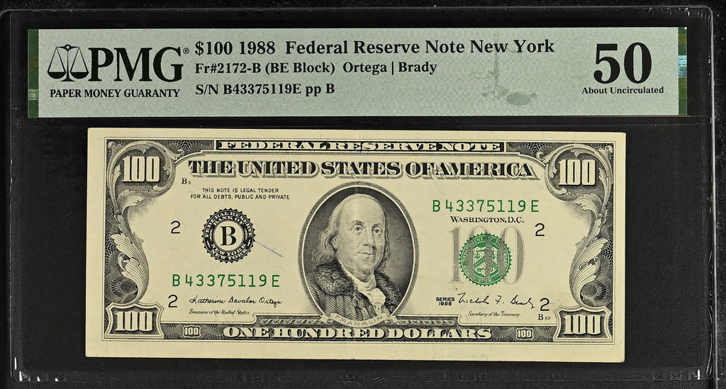 1988 $100 Federal Reserve Note New York Dollar Bill - Fr#2172-B, BE Block, Ortega/Brady - PMG Graded 50