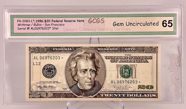 1996 $20 Federal Reserve Note San Francisco Dollar Bill - Fr#2083-L*, Withrow/Rubin - GCGS Graded 65