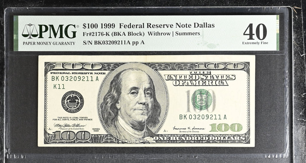 1999 $100 Federal Reserve Note Dallas Dollar Bill - Fr#2176-K, BKB Block, Withrow/Summers - PMG Graded 40