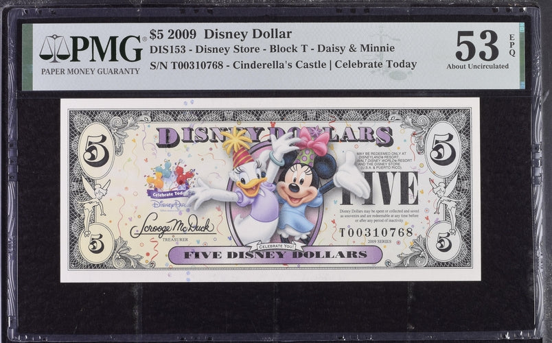 2009 $5 Disney Dollar Bill - DIS153, Disney Store, Block T, Daisy & Minnie - PMG Graded 53