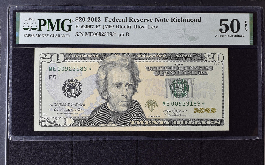 2013 $20 Federal Reserve Note Richmond Dollar Bill - Fr#2097-E*, ME* Block, Rios/Lew - PMG Graded 50